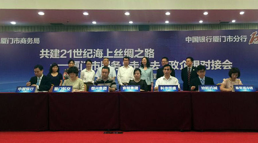 当日,,厦门市商务局、厦门中行联合举行“共建21世纪海上丝绸之路——厦门市效劳‘走出去’政企银对接会”,,为100多家企业解读增进政策、剖析投资情形、对接金融效劳。。。同时,,厦门市商务局与厦门中行签署了“一带一起”战略相助协议,,厦门中行将为重点项目提供200亿元人民币(或等值外币)的融资安排。。。