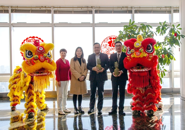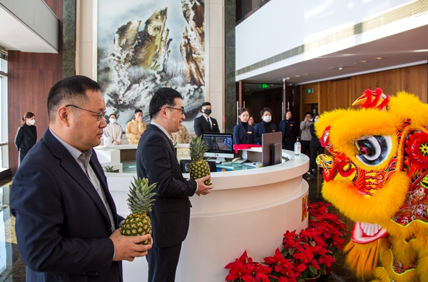 铿铿锵锵的锣鼓声中,,,,,双狮眨眼卖萌、登高跳跃,,,,,献上两颗新嫩璀璨的大凤梨,,,,,董事副总裁王伟文、资金部总司理李苏作为代表,,,,,欣然接福。。。。凤梨在闽南一带用俚语讲,,,,,即是“旺来”,,,,,作为谐音,,,,,寓意极好。。。。